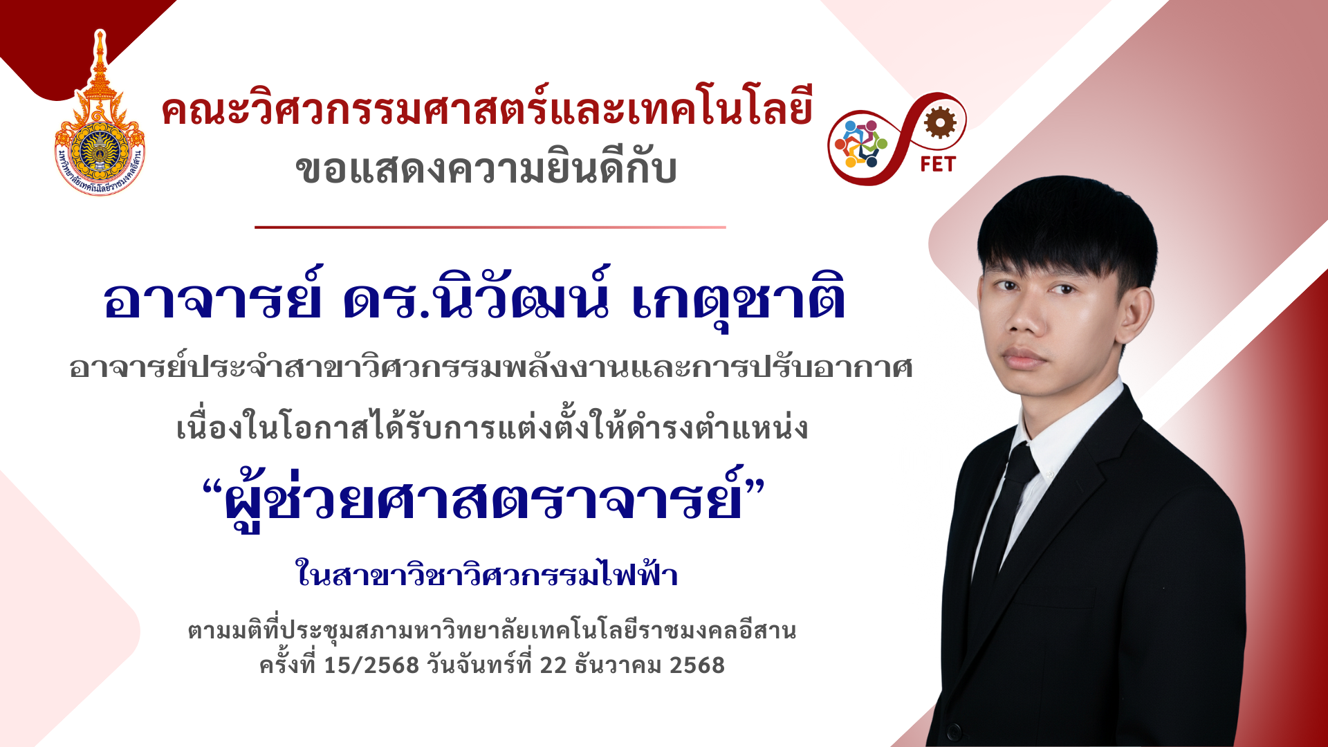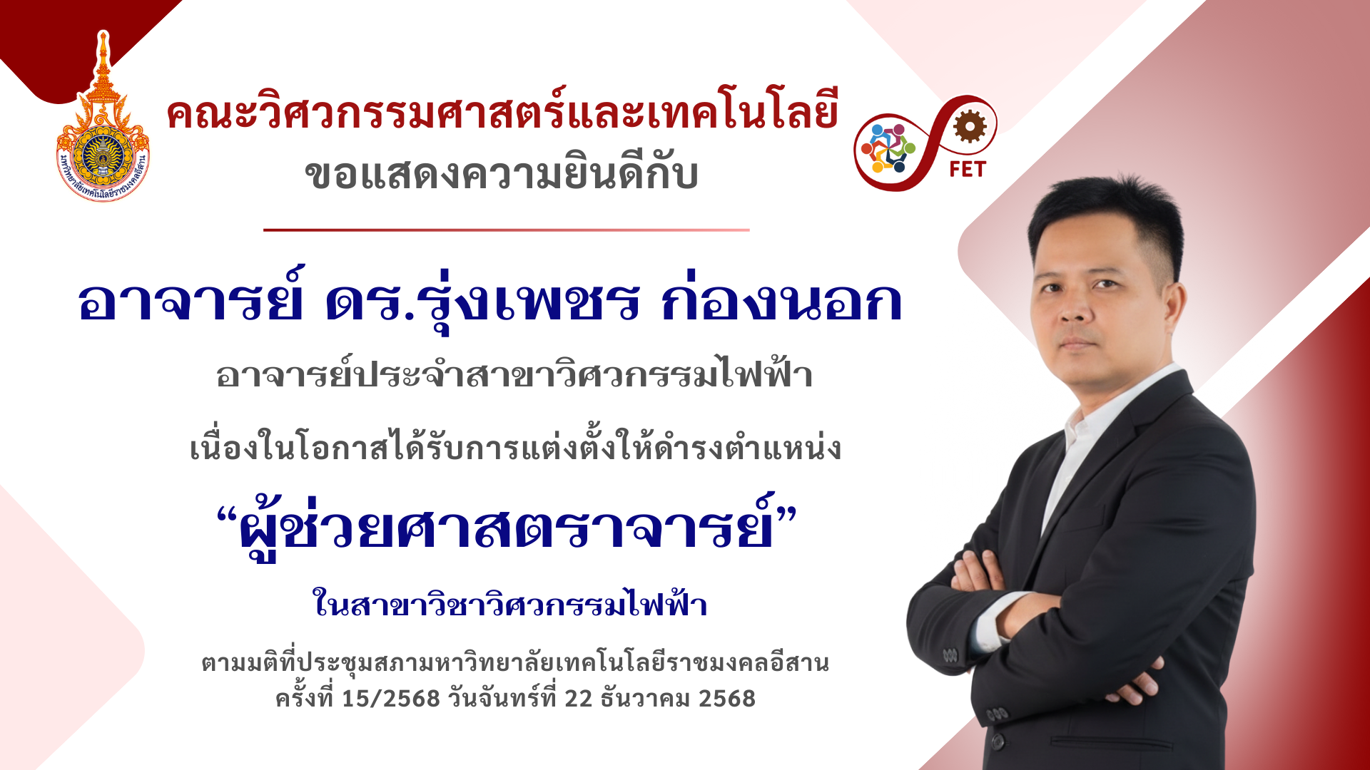 คณะวิศวกรรมศาสตร์และเทคโนโลยี ขอแสดงความยินดีกับ อาจารย์ ดร.วิจัย บุญญานุสิทธิ์ อาจารย์ประจำสาขาวิศวกรรมอุตสาหการ ได้รับการแต่งตั้งให้ดำรงตำแหน่ง หัวหน้าสำนักศึกษาทั่วไป มีผลตั้งแต่วันที่ 1 ตุลาคม พ.ศ. 2567 เป็นต้นไป ตามคำสั่งมหาวิทยาลัยเทคโนโลยีราชมงคลอีสาน ที่ 1425/2567 ลงวันที่ 20 กันยายน 2567