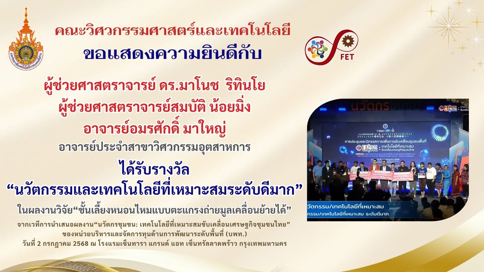 และอาจารย์อมรศักดิ์ มาใหญ่ อาจารย์ประจำสาขาวิศวกรรมอุตสาหการ ได้รับรางวัล “นวัตกรรมและเทคโนโลยีที่เหมาะสมระดับดีมาก” ในผลงานวิจัย“ชั้นเลี้ยงหนอนไหมแบบตะแกรงถ่ายมูลเคลื่อนย้ายได้” จากเวทีการนำเสนอผลงาน“นวัตกรชุมชน: เทคโนโลยีที่เหมาะสมขับเคลื่อนเศรษฐกิจชุมชนไทย” ของหน่วยบริหารและจัดการทุนด้านการพัฒนาระดับพื้นที่ (บพท.) วันที่ 2 กรกฎาคม 2568 ณ โรงแรมเซ็นทารา แกรนด์ แอท เซ็นทรัลลาดพร้าว กรุงเทพมหานคร