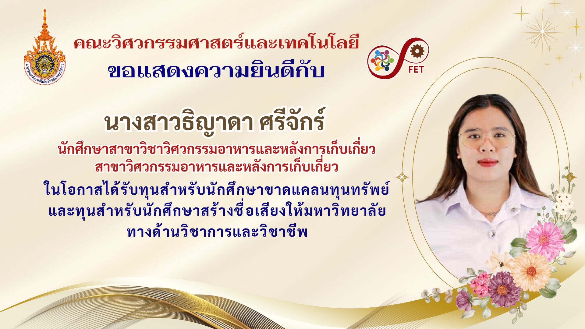 คณะวิศวกรรมศาสตร์และเทคโนโลยี ขอแสดงความยินดีกับนักศึกษาที่ได้รับทุนสำหรับนักศึกษาขาดแคลนทุนทรัพย์และทุนสำหรับนักศึกษาสร้างชื่อเสียงให้มหาวิทยาลัย ทางด้านวิชาการและวิชาชีพ มีรายชื่อดังนี้