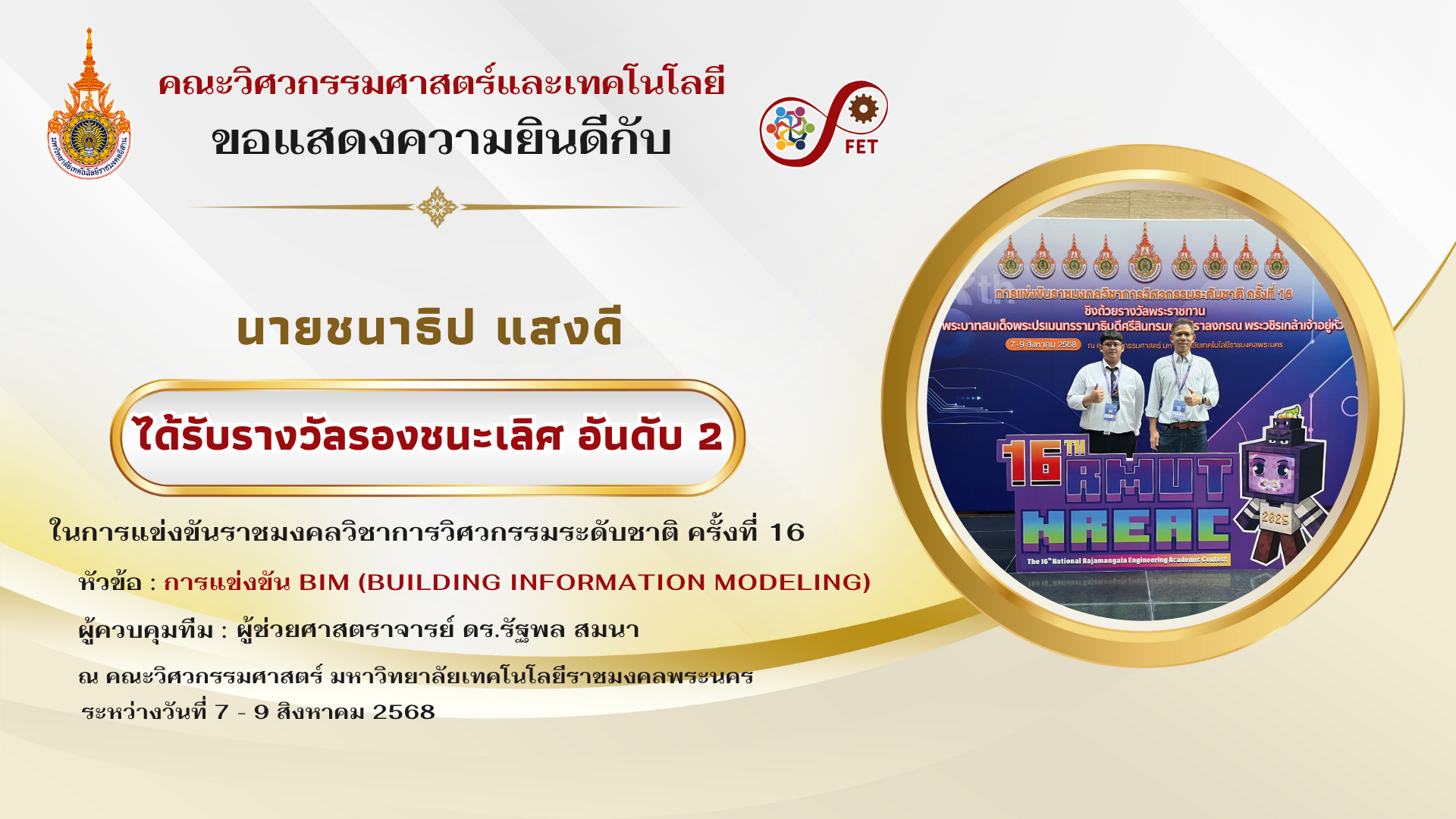 คณะวิศวกรรมศาสตร์และเทคโนโลยี ขอแสดงความยินดีกับ นายชนาธิป แสงดี
